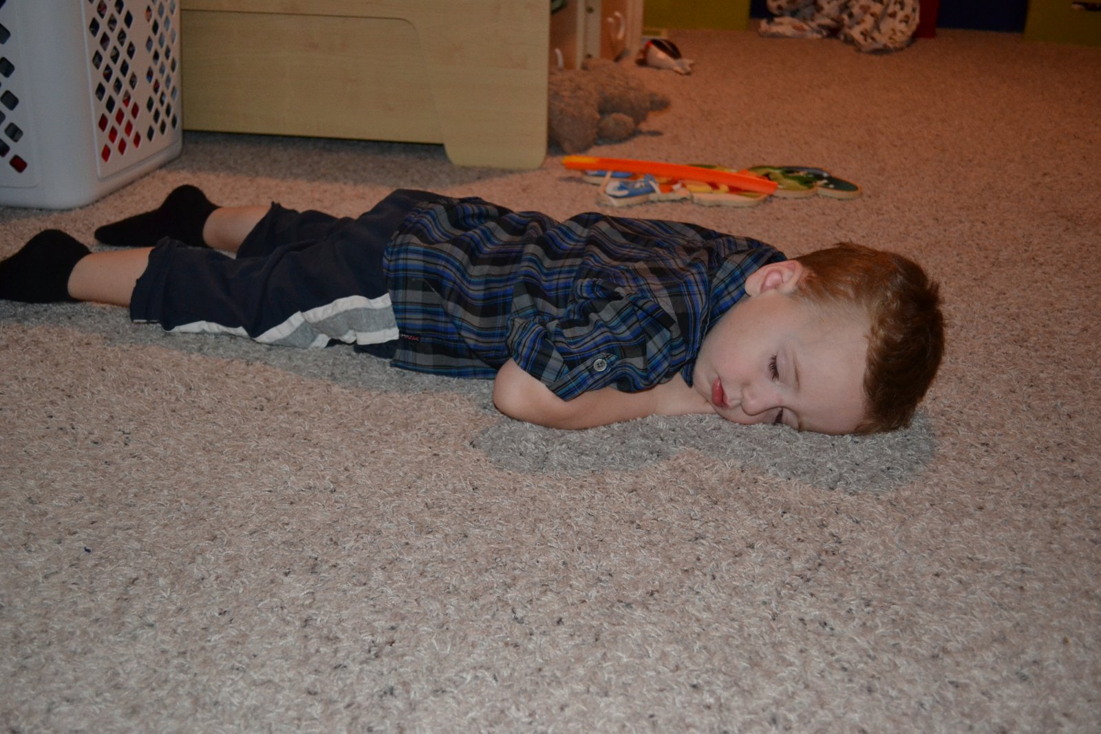Poor little guys was simply all tuckered out. He had fallen right to sleep in the middle of his floor. |